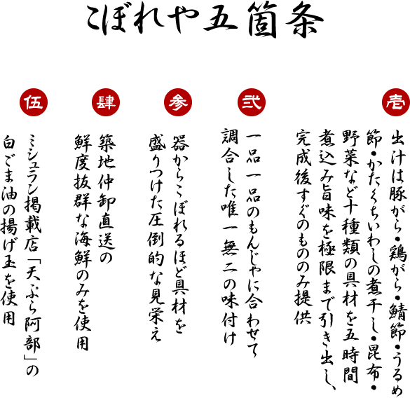 数千の商品案から自信をもって提供できる13のもんじゃに厳選しました。こぼれるほどの具材をのせ、もんじゃのベースとなるソース味に限定せず、一品一品にあわせた味付けでソースや醤油、塩、味噌などをベースとしたあらゆる味覚をご堪能いただけます。また当店独自の調理方法を実現し、他店には決してない唯一無二の創作もんじゃをご提供します。