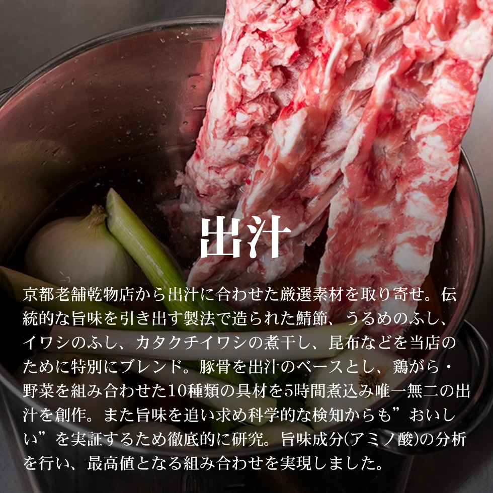 京都老舗乾物店から出汁に合わせた厳選素材を取り寄せ。伝統的な旨味を引き出す製法で造られた鯖節、うるめのふし、イワシのふし、カタクチイワシの煮干し、昆布などを当店のために特別にブレンド。豚骨を出汁のベースとし、鶏がら・野菜を組み合わせた10種類の具材を5時間煮込み唯一無二の出汁を創作。また旨味を追い求め科学的な検知からも”おいしい”を実証するため徹底的に研究。旨味成分(アミノ酸)の分析を行い、最高値となる組み合わせを実現しました。