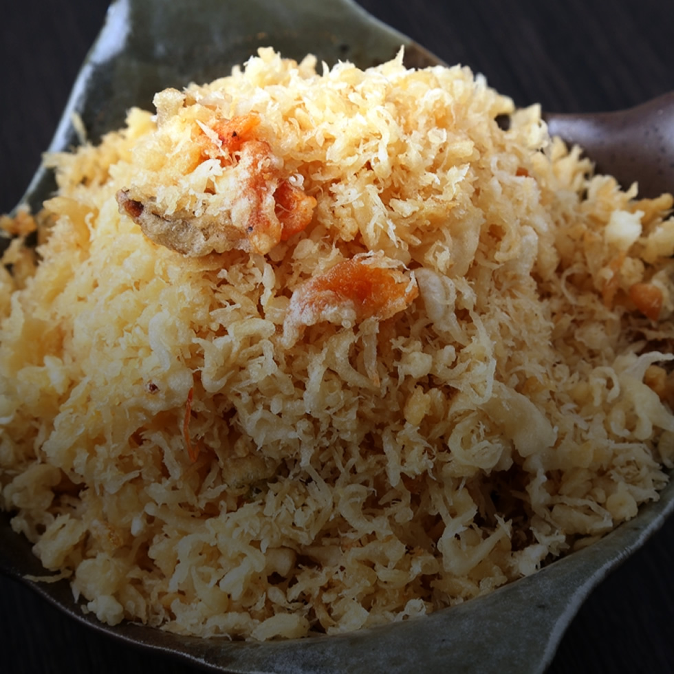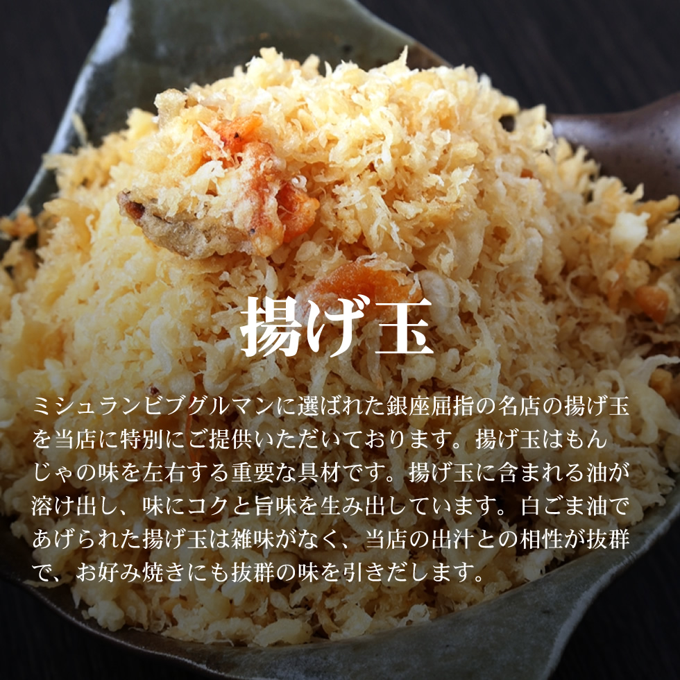 ミシュランビブグルマンに選ばれた銀座屈指の名店の揚げ玉を当店に特別にご提供いただいております。揚げ玉はもんじゃの味を左右する重要な具材です。揚げ玉に含まれる油が溶け出し、味にコクと旨味を生み出しています。白ごま油であげられた揚げ玉は雑味がなく、当店の出汁との相性が抜群で、お好み焼きにも抜群の味を引きだします。
