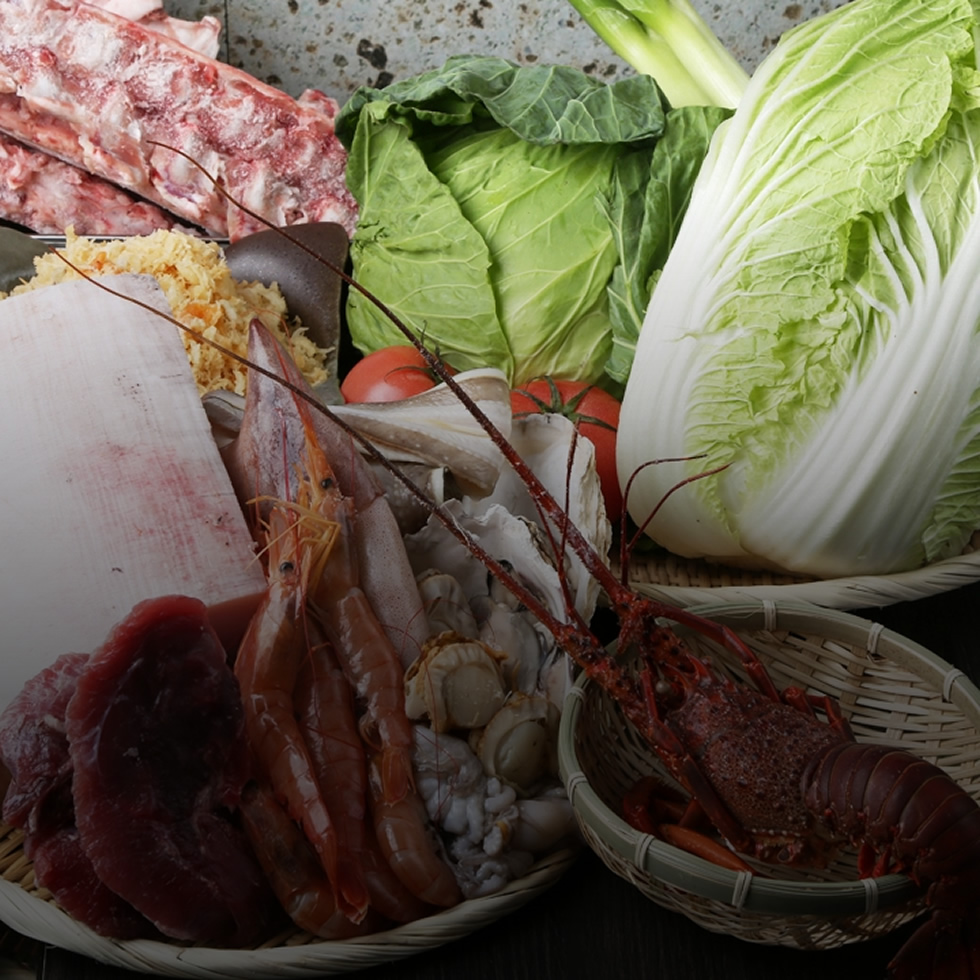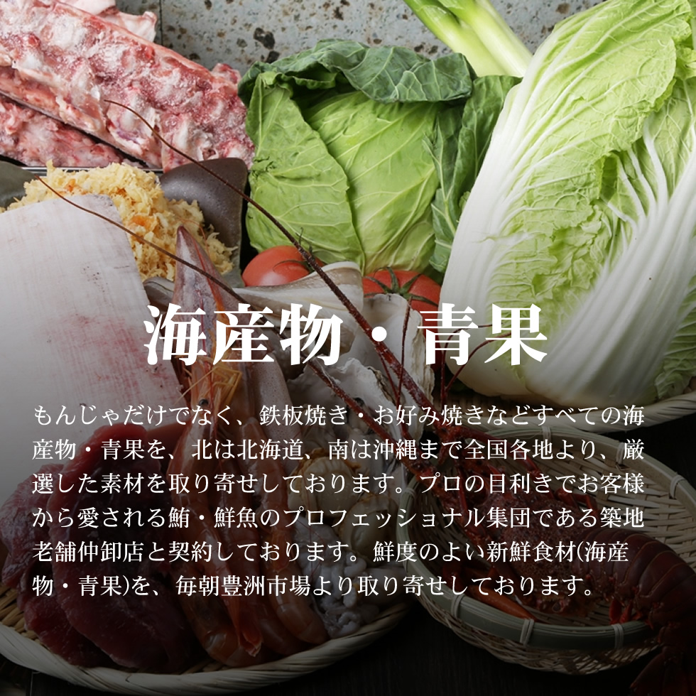 もんじゃだけでなく、鉄板焼き・お好み焼きなどすべての海産物・青果を、北は北海道、南は沖縄まで全国各地より、厳選した素材を取り寄せしております。プロの目利きでお客様から愛される鮪・鮮魚のプロフェッショナル集団である築地老舗仲卸店と契約しております。鮮度のよい新鮮食材(海産物・青果)を、毎朝豊洲市場より取り寄せしております。