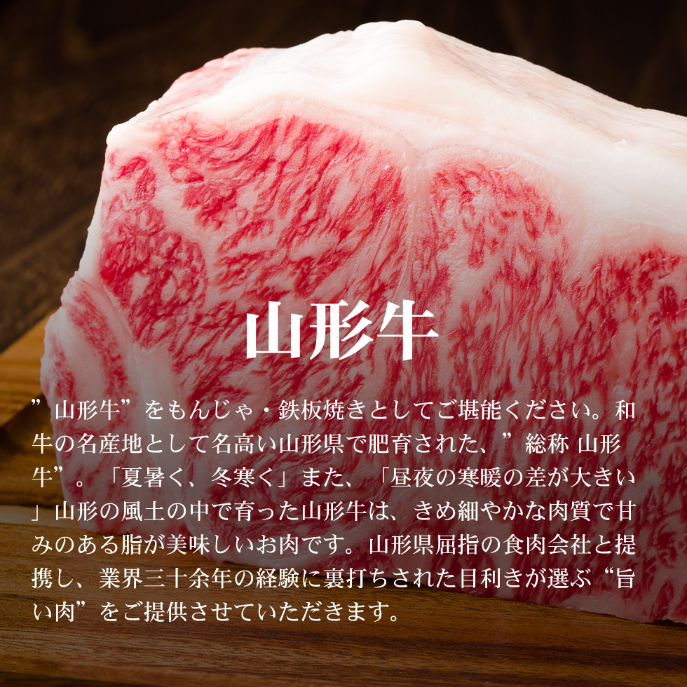 ”山形牛”をもんじゃ・鉄板焼きとしてご堪能ください。和牛の名産地として名高い山形県で肥育された、”総称 山形牛”。「夏暑く、冬寒く」また、「昼夜の寒暖の差が大きい」山形の風土の中で育った山形牛は、きめ細やかな肉質で甘みのある脂が美味しいお肉です。山形県屈指の食肉会社と提携し、業界三十余年の経験に裏打ちされた目利きが選ぶ“旨い肉”をご提供させていただきます。