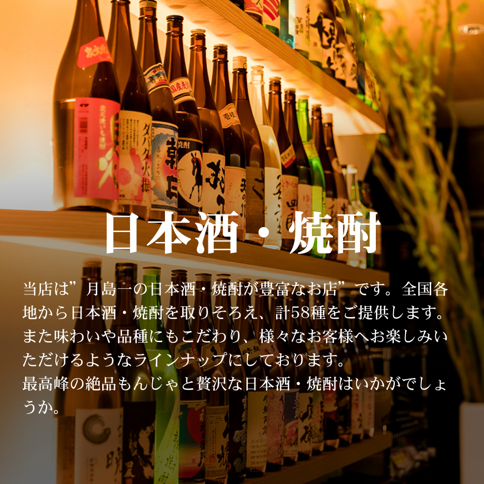 当店は”月島一の日本酒・焼酎が豊富なお店”です。全国各地から日本酒・焼酎を取りそろえ、計58種をご提供します。また味わいや品種にもこだわり、様々なお客様へお楽しみいただけるようなラインナップにしております。